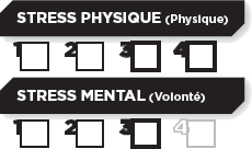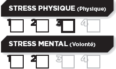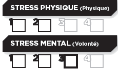 Zird l’Hermétique, qui est plutôt du genre à bouquiner, a un Physique Médiocre (+0), il reste donc avec deux cases par défaut pour sa jauge de stress physique. Sa Volonté Passable (+2) lui octroie un bonus d’une case de stress mental.